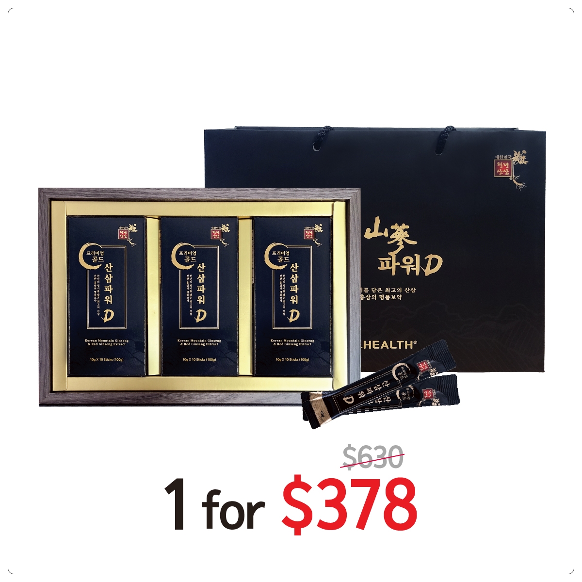 100년근 천종산삼을 식물체세포 복제기술을 이용하여 생산한 산삼배양근과 한국산 6년근 홍삼을 혼합하여 제조한 스틱형 액상제품입니다. 바쁜 일상에서도 편리하고 간편하게 언제 어디서나 복용할 수 있는“프리미엄 골드산삼 파워데이”로 생활의 활력과 기력이 넘치는 하루를 시작할 수 있는 명품보약입니다. “프리미엄 골드 산삼 파워데이” 제품은 1포(10g)당 진세노사이드(Rg1+Rb1+Rg3) 함량이 32.1mg으로 기존 홍삼제품에 비해 3배가량의 진세노사이드 함량을 보이고 있고 100년근 산삼 9뿌리 분량의 산삼배양근추출액 70% 에 홍삼농축액 30% 로 오직 두 가지 원료만으로 제조한 최고급 프리미엄 제품입니다.